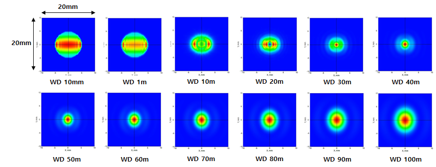 설계에서는 초기 beam size가 truncated 형태(잘린 형태)이고 시작점에서의 wavefront의 R이 평행광이 아니기 때문에 결과에 차이가 날 수 있으므로 반드시 레이저 모델링을 통한 simulation으로 확인해야 합니다. 광효율과 광분포를 고려하여 초점거리 50mm인 렌즈를 사용해서 simulation을 해보면, 중간에 조금 작아지다가 커지는 것을 알 수 있습니다. 전형적인 Gaussian beam propagation이죠.