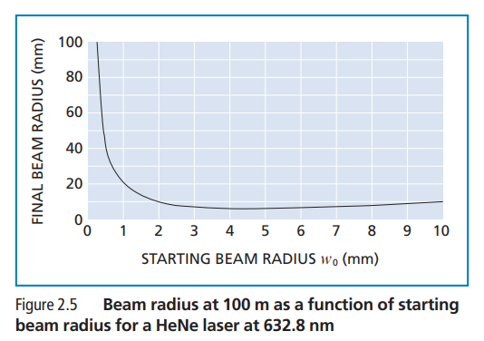 최근에 고객사로부터 50~100m 거리에서도 beam size가 15mm이내로 들어오는 레이저다이오드 광모듈을 제작의뢰 받았습니다. 아래 그림은 위의 자료에 있는 것인데요. 100m거리에서 15mm정도 유지하려면 초기빔은 10mm정도여야 한다는 것을 보여줍니다. 초기빔이 너무 작은 경우, 예로 대략 2mm일 경우는 100m에서 40mm로 늘어나는데, 대부분의 레이저 포인터가 이런 제품입니다. 물론 laser의 발광포인트가 렌즈의 초점거리에 정확하게 일치할 때 해당해서 실제 제품은 이보다는 훨씬 많이 퍼지는 경향이 있습니다.