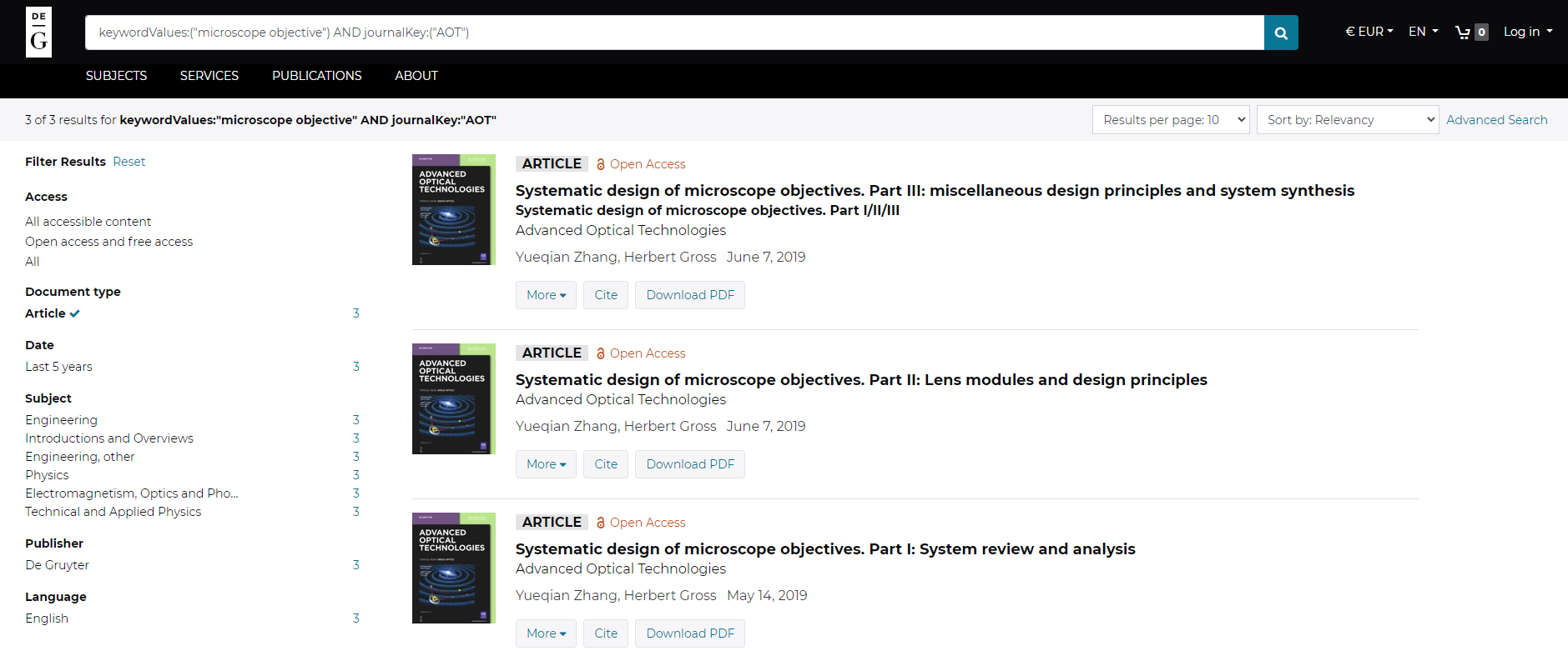 https://www.degruyter.com/search?query=keywordValues%3A%28%22microscope%20objective%22%29%20AND%20journalKey%3A%28%22AOT%22%29&documentTypeFacet=article 지난 해 하반기부터 국책과제로 High NA IR objective lens를 개발하고 있습니다. 이 번달이면 proto가 나올 수 있겠네요. 대물렌즈 설계할 때 참고한 자료인데, 정말 잘 정리되어 있습니다. 이처럼 풍부한 자료는 더 찾기 어렵지 않을까 생각합니다. 이를 Open access로 공개해서 참 고맙지요. 저도 이 자료 보면서 대물렌즈에 대한 이해가 많이 넓어지고 깊어진 것을 알 수 있었습니다. 설계는 CodeV의 glass..